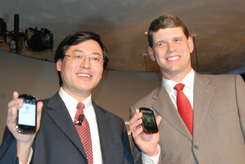 圖:聯(lián)想集團(tuán)CEO楊元慶和COO Rory Read向與會者展示聯(lián)想集團(tuán)首款智能手機(jī)樂phone