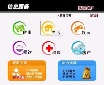 在上海IPTV提供的業(yè)務(wù)中,信息服務(wù)也是眾多用戶喜聞樂見的一項業(yè)務(wù),內(nèi)容覆蓋廣泛。它提供了時事、生活、娛樂、餐飲、健康、房產(chǎn)等信息,其中“時事”一欄呈現(xiàn)了新浪上海熱線實時傳遞的全球最新新聞資訊,讓老百姓“手握遙控器,便知天下事”,“健康”一欄更是一網(wǎng)打盡上海地區(qū)醫(yī)療機構(gòu)的信息資訊,特色專科搜索為用戶提供便捷的醫(yī)療信息服務(wù),“房產(chǎn)”中上海地區(qū)各類二手房產(chǎn)訊息一應(yīng)俱全,價格、地段、房型等應(yīng)有盡有。