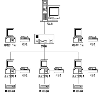系統(tǒng)由IC卡閱讀器、工作站、服務(wù)器、打印機(jī)、相應(yīng)網(wǎng)絡(luò)及管理軟件組成。由工作站接收IC卡閱讀器的客戶(hù)數(shù)據(jù)并輸入消費(fèi)業(yè)務(wù)數(shù)據(jù),通過(guò)網(wǎng)絡(luò)保存到服務(wù)器。