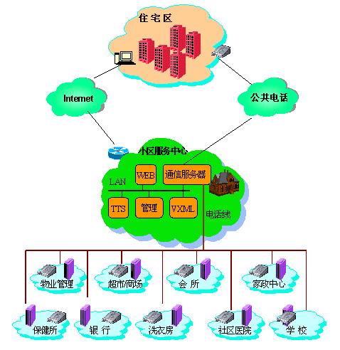 以國際標準的VXMLl技術(shù)為主導的小區(qū)服務(wù)中心系統(tǒng)可以與互聯(lián)網(wǎng)輕易地連通,從而為小區(qū)的服務(wù)網(wǎng)點走出小區(qū)的地域限制做好技術(shù)上的儲備。vxml的易開發(fā)和易擴展性,使得遠程服務(wù)的增加,幾乎不需要任何成本的追加,任何第三方服務(wù)提供者具備vxml業(yè)務(wù),都可以直接掛到服務(wù)中心上來。