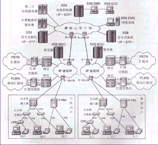 SS8信令交換機可構建全球性的智能化IP網(wǎng)絡的語音通信交換系統(tǒng),在此網(wǎng)絡上能夠承載語音、數(shù)據(jù)和視頻圖象通信業(yè)務。具體見圖1。