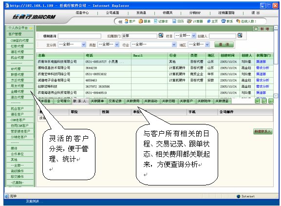 任我行-協(xié)同CRM把企業(yè)各部門與客戶交往過程中的所有記錄,比如業(yè)務(wù)記錄、業(yè)務(wù)員日程按排、客服記錄、銷售過程、工作報(bào)告、業(yè)務(wù)合同、銷售記錄、銷售費(fèi)用等,進(jìn)行這樣分類管理,這樣,就把企業(yè)離散的客戶資料統(tǒng)一管理起來,把企業(yè)個(gè)部門與客戶的銷售過程及服務(wù)等信息象珠子一樣串起來,而不是以前那種散亂、信息殘缺,讓查閱者對(duì)所需要關(guān)注的客戶"一目了然"。