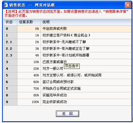 舉例4:對(duì)一個(gè)老板而言,對(duì)銷售員的管理,假設(shè)有5個(gè)業(yè)務(wù)員,每個(gè)業(yè)務(wù)員有5個(gè)單子,共計(jì)5*5=25個(gè)單子,通常的做法是讓業(yè)務(wù)員提交周報(bào),針對(duì)每個(gè)單子描述一下詳細(xì)情況,比如:XX單子,搞定了老板,但下面的人不滿意,需要如何如何;XX單子,搞定了老板,但老板出差了。。。。。。,這樣的25個(gè)描述,看了也白看。最科學(xué)的做法是:先看每個(gè)業(yè)務(wù)員的客戶跟蹤大概,比如,每個(gè)客戶跟蹤的狀態(tài),如果想了解詳細(xì)的進(jìn)程,再進(jìn)行詳細(xì)了解。在協(xié)同CRM里面,是先看針對(duì)每個(gè)業(yè)務(wù)員跟單的狀態(tài),比如張三跟的單子,有哪些9狀態(tài)的,有哪些8狀態(tài),有哪些7狀態(tài)等等,還有哪些單子跟了很久狀態(tài)沒發(fā)生變化的。