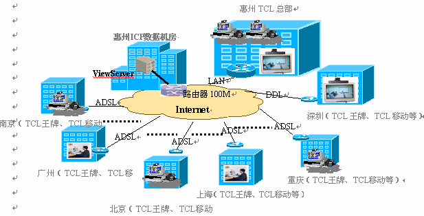 TCL集團(tuán)利用ViewMeeting實現(xiàn)可視協(xié)同辦公系統(tǒng)的組網(wǎng)圖: