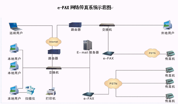 e-FAX網絡傳真機 的工作原理是利用內部設備對傳真和語音信號的存儲及轉換功能,在網絡配置許可的范圍內 , 主要實現(xiàn)了自動接收和發(fā)送傳真的功能。系統(tǒng)內用戶能通過電子郵件和網頁方式收取自己的傳真或語音,發(fā)送傳真時只需要提交傳真給傳真服務器,服務器能自動發(fā)送。系統(tǒng)外用戶能在語音流程的提示下發(fā)送或接收傳真,也可以選擇發(fā)送留言信息。系統(tǒng)管理員則可以對系統(tǒng)進行參數(shù)配置,流程定制和用戶信息管理等功能操作。