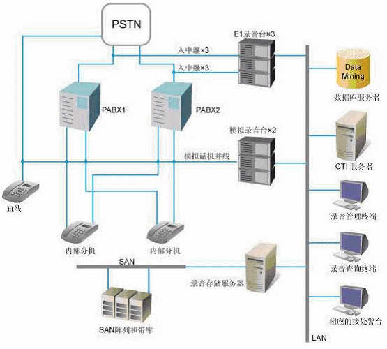 錄音系統(tǒng)還要求錄音文件統(tǒng)一保存在基于SAN結(jié)構(gòu)的存儲(chǔ)系統(tǒng)中,并具有完備的存儲(chǔ)、備份功能。