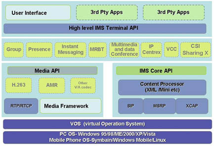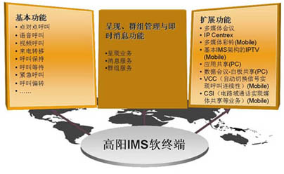 高陽IMS軟終端產(chǎn)品線是基于IMS(IP多媒體子系統(tǒng))技術,以通信終端功能為主,融入IT特性,將在線狀態(tài)、即時消息和群組管理融為一體,集合語音、數(shù)據(jù)、視頻通信,提供統(tǒng)一的用戶體驗,實現(xiàn)移動電話、PC之間的互聯(lián)互通,并且符合3GPP/ETSI/OMA/IETF/ITU-T等國際標準組織和中國電信/中國移動規(guī)定的IMS相關規(guī)范。