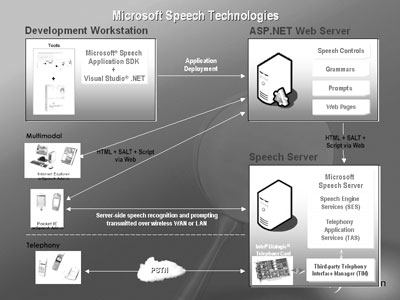 在語音應(yīng)用方面微軟是一個(gè)先行者,在語音應(yīng)用還沒有被人們所認(rèn)識(shí)的時(shí)候微軟已經(jīng)推出了自己的桌面語音產(chǎn)品(大家應(yīng)該都知道金山詞霸中的單詞發(fā)音,它使用的就是微軟TTS引擎)。而Speech Server 2004是微軟今年新推出的基于Web的語音服務(wù)器端產(chǎn)品,它主要分為兩個(gè)部分:SES(Speech Engine Services)和TAS(Telephony Application Services)。其中SES是語音引擎服務(wù),包括SAPI、語音輸入以及語音識(shí)別,支持話音、PPC以及桌面語音;TAS是電話應(yīng)用服務(wù),集成了SALT以及媒體與語音管理,是第三方話音界面與Speech Server的接口。