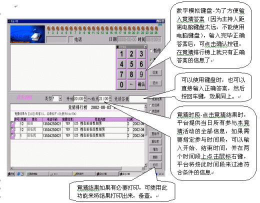 竟猜前必須對聽眾廣播,為了竟猜的準(zhǔn)確性,希望發(fā)送信息時,必須把竟猜結(jié)果發(fā)送在前面, 如(12345姓名李立),否則,系統(tǒng)將不能識別其答案。竟猜結(jié)束時,只要點擊竟猜結(jié)果選項,系統(tǒng)會自動將所有參與本節(jié)目的竟猜結(jié)果統(tǒng)計出來(此時沒有限制時間段),如果需要限制時間段,則應(yīng)在"開始"、"結(jié)束"時間段中輸入開始和結(jié)束的時間,并在其中任何一個時間段上點擊鼠標(biāo)右鍵,系統(tǒng)將會自動過濾出符合條件的信息。
