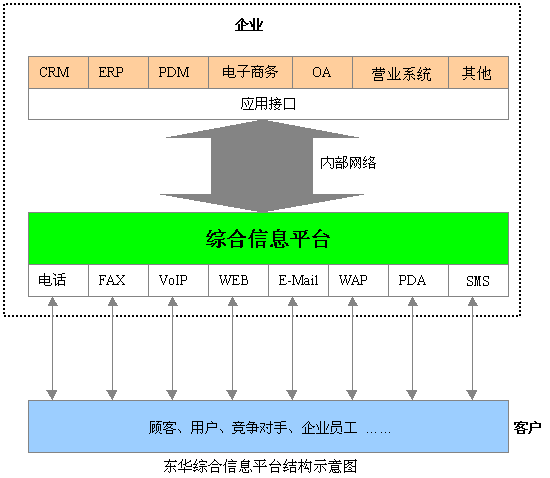 東華集團(tuán)綜合信息平臺系統(tǒng)可集中企業(yè)客戶服務(wù)的優(yōu)勢資源,采用人工業(yè)務(wù)代表服務(wù)與自動語音服務(wù)相結(jié)合的形式,通過電話、Email、Web、尋呼、IP電話/傳真、視頻、段消息等接入方式和服務(wù)手段,向客戶提供業(yè)務(wù)受理、信息查詢、商品定購服務(wù),以及接受客戶的咨詢、建議及投訴,也可以通過主動撥出做社會調(diào)查、市場調(diào)查、商品直銷及資費(fèi)欠費(fèi)催繳等。