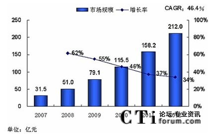 再來看看統(tǒng)一市場的前景,下圖是某咨詢公司對國內統(tǒng)一通信市場的預測數據,2012年將達到212億元,盡管可能存在一定水份,但這么多公司介入這個市場,本身就體現了發(fā)展?jié)摿Γ@點不容懷疑。