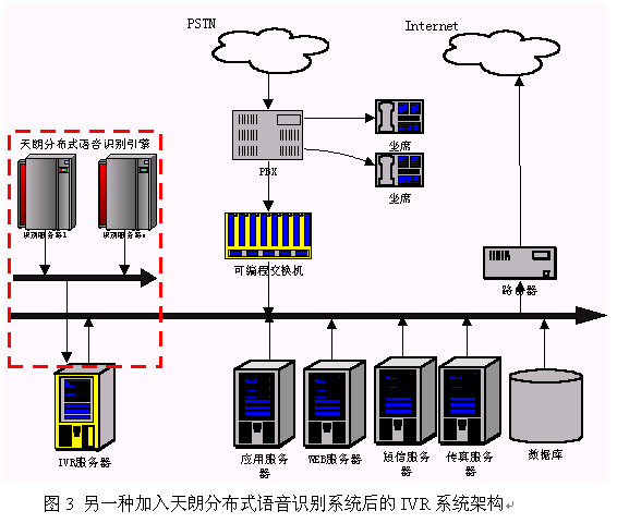 硬件連接:天朗分布式語(yǔ)音識(shí)別系統(tǒng)是通過(guò)局域網(wǎng)來(lái)把客戶(hù)端和服務(wù)器連在一起。因此在硬件上把天朗分布式語(yǔ)音識(shí)別系統(tǒng)聯(lián)入到IVR的一種簡(jiǎn)單的辦法是把引擎的所有服務(wù)器接入到系統(tǒng)現(xiàn)有的局域網(wǎng)中,使得識(shí)別服務(wù)器能和IVR服務(wù)器通過(guò)TCP/IP通訊即可。連接后的系統(tǒng)架構(gòu)可以用圖2來(lái)表示。
