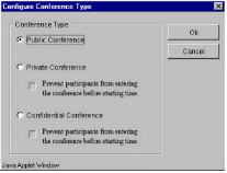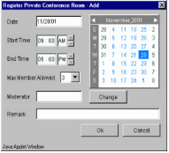 TeleConference系統(tǒng)內(nèi)的任一個分機(jī),都可以利用瀏覽器(Internet Browser)來預(yù)約會議時(shí)間,而參加會議的人可以在會議開始時(shí),自動打電話進(jìn)系統(tǒng)參加會議就像加入“聊天室“一樣簡單。