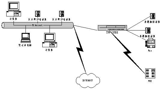 在一個有很多分支機構(gòu)的大企業(yè)的分部安裝Tw-IPBX ,通過IP 網(wǎng)絡與企業(yè)總部PBX 連接后后,可實現(xiàn)多種應用,同時降低了成本。在這種應用場景中,采用了基于IP 的傳輸機制(VoIP)。此種情況下VoIP的美好之處在于語音和數(shù)據(jù)的IP 傳輸管路需求(根據(jù)呼叫)的無縫可伸縮性,而無需任何靜態(tài)的分區(qū),這種解決方案可提供性能價格比極高且靈活的網(wǎng)絡運作。