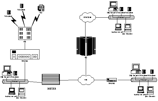 該應用示意圖具有一個(iPBX )或多個辦公場地(nIPBX - 組網(wǎng)iPBX )提供電話系統(tǒng)解決方案。該解決方案是基于IP 電話技術而構(gòu)建的Tw-IPBX “一體化概念”,同時可提供傳統(tǒng)的模擬電話概念,如模擬電話和傳真機。以下敘述了客戶機組合的單獨應用場景,包括: