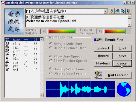 "得意"口語學(xué)習(xí)系統(tǒng)的原理是基于語音音素及其他參數(shù)的提取與分割,將使用者的語音音素系列與標(biāo)準(zhǔn)模型的語音音素序列進(jìn)行自動比對,并將比對結(jié)果通過視圖形象而直觀地給出,從而對學(xué)習(xí)者的語音給出恰當(dāng)?shù)脑u價(jià)(比如對每個(gè)音素給出一個(gè)得分等),以幫助其改進(jìn)和提高口語發(fā)音,使其接近或達(dá)到語音的標(biāo)準(zhǔn)水平。由于利用可視化的朗讀評分等人機(jī)交互的方式,而且通過視覺、聽覺等綜合手段,反復(fù)提示和幫助用戶接近標(biāo)準(zhǔn)發(fā)音,因而顯著提高了學(xué)習(xí)者的學(xué)習(xí)興趣,這對提高英語學(xué)習(xí)成績有很多幫助。