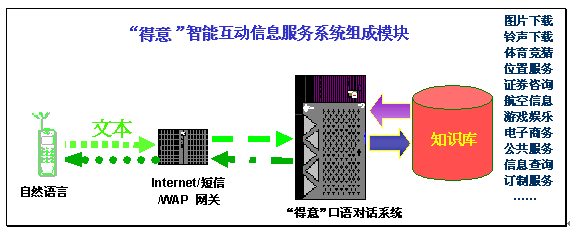 "得意"智能互動(dòng)信息服務(wù),是對(duì)用戶(hù)輸入的文本進(jìn)行自動(dòng)分析和理解,再?gòu)闹R(shí)庫(kù)中提取用戶(hù)所需的信息,然后自動(dòng)產(chǎn)生智能應(yīng)答語(yǔ)句,并以文本的形式通過(guò)電腦或者手機(jī)發(fā)回用戶(hù)。由于"得意"口語(yǔ)對(duì)話系統(tǒng)具有上下文相關(guān)理解和人機(jī)混合主導(dǎo)等強(qiáng)大功能,在指定的領(lǐng)域內(nèi),用戶(hù)可通過(guò)一次或者多次輸入(包括詞語(yǔ)、句子)構(gòu)成一組對(duì)話,完成復(fù)雜的信息查詢(xún)或者其他互動(dòng)信息服務(wù)。