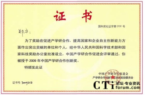 CTI論壇(ctiforum)11月26日消息(記者 潘婷):2009年11月7日,得意公司董事長鄭方博士獲中國產(chǎn)學(xué)研合作促進會2009年度中國產(chǎn)學(xué)研合作創(chuàng)新獎。該獎勵是面向國內(nèi)在促進產(chǎn)學(xué)研合作及創(chuàng)新方面做出突出貢獻的單位及個人所頒發(fā)的年度榮譽獎。