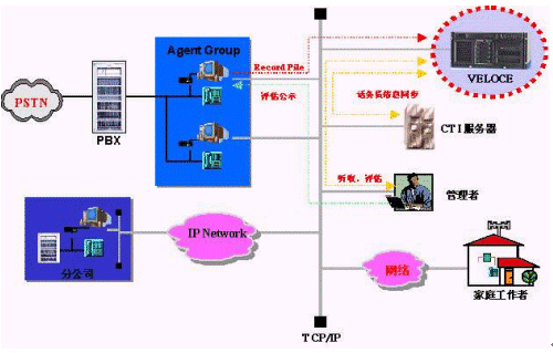 現(xiàn)在國內(nèi)市場上的絕大部分錄音設(shè)備是基于語音板卡的,而VELOCE 是通過小巧的USB錄音模塊連接到話務(wù)員PC上,利用數(shù)字語音壓縮技術(shù)和加密技術(shù)把通話內(nèi)容存儲到話務(wù)員PC, 并通過網(wǎng)絡(luò)傳輸?shù)椒⻊?wù)器, 它是通過硬/軟件的錄音方式和網(wǎng)絡(luò)傳輸方式的結(jié)合體。