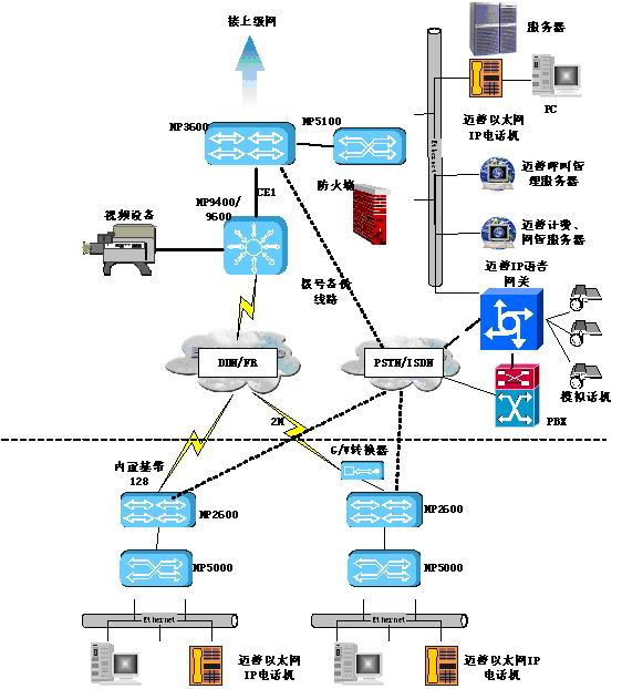 目前許多公安系統(tǒng)雖然采用具有IP語音功能的路由設(shè)備組建網(wǎng)絡(luò),但在業(yè)務(wù)語音交流通常還通過PBX集團(tuán)交換機(jī)走電信PSTN/ISDN電話網(wǎng),這樣無法節(jié)省電話費(fèi)用,反而增加了辦公費(fèi)用。邁普IP語音解決方案采用了邁普MyPower VG2000IP語音網(wǎng)關(guān)和邁普以太網(wǎng)IP電話進(jìn)行改造。在整個網(wǎng)點(diǎn)語音終端全部設(shè)備選用經(jīng)濟(jì)型邁普以太網(wǎng)IP電話機(jī),它采用雙以太口設(shè)計,使網(wǎng)絡(luò)無需重新布線,同時也可使用已有的路由器上IP語音模塊;邁普以太網(wǎng)IP電話機(jī)之間的話音通信通過邁普呼叫管理服務(wù)器集中控制。在主體IP網(wǎng)絡(luò)中,邁普IP語音網(wǎng)關(guān)放置于中心機(jī)房作為傳統(tǒng)PSTN的出口,可以通過VOS接口、E1接口(中國一號信令)、E&M接口等多種方式接入公安PBX,將PSTN線路傳來的時分話音或傳真信息進(jìn)行分組和壓縮,轉(zhuǎn)換成IP數(shù)據(jù)包,通過路由設(shè)備路由到目的地;在沒有PBX的公安機(jī)房,邁普IP語音網(wǎng)關(guān)可以提供32路的模擬用戶接口,可以完全替代傳統(tǒng)PBX并接入PSTN,并提供額外功能,如圖中虛線所示;整個方案還可以針對公安用戶特殊需求"定做"特色功能,例如緊急告警等方便日常辦公。
