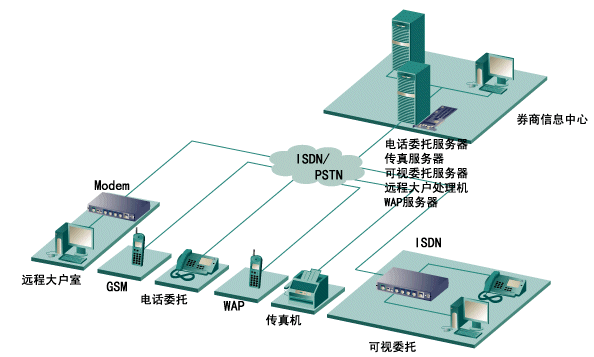 券商證券委托一般包括:電話傳真委托、可視委托(又稱(chēng)遠(yuǎn)程大戶室)和網(wǎng)上委托等。其中除網(wǎng)上委托可通過(guò)Internet網(wǎng)外,其它委托必須通過(guò)PSTN網(wǎng)來(lái)連接。在當(dāng)前階段,此類(lèi)委托占有最大的客戶群。以前,每個(gè)券商為了實(shí)現(xiàn)此類(lèi)委 托,必須在券商中心的機(jī)器上安裝語(yǔ)音卡、傳真卡、座席卡來(lái)滿足電話傳真委托,另外還必須在另外一臺(tái)機(jī)器上安裝多串口卡和Modem Pool與座席卡相連來(lái)滿足可視委托,遠(yuǎn)程大戶室等業(yè)務(wù)。此方案,用戶不僅需要購(gòu)買(mǎi)很多卡,占用很多機(jī)器插槽,而且在實(shí)現(xiàn)可視委托時(shí),只能接受客戶端PSTN模擬Modem的呼叫,而不能接收目前ISDN的連接方式,速度非常緩慢。本文主要提出了一種采用Eicon Diva Server PRI卡的新型解決方案,本方案不僅省去了在中心插上傳真卡、語(yǔ)音卡、座席卡多種卡,又省去了多串口卡和Modem Pool構(gòu)件,只需在中心的一臺(tái)機(jī)器插上1-4塊Diva Server PRI卡后,便能滿足你電話傳真委托、可視委托 、遠(yuǎn)程大戶室等多種業(yè)務(wù),還支持WAP呼叫,SMS短消息發(fā)送等,在可視委托和遠(yuǎn)程大戶室業(yè)務(wù)中,不僅支持PSTN Modem的模擬呼叫,也支持ISDN的數(shù)字呼叫,方案的性?xún)r(jià)比極高,方案連接圖如下圖所示: