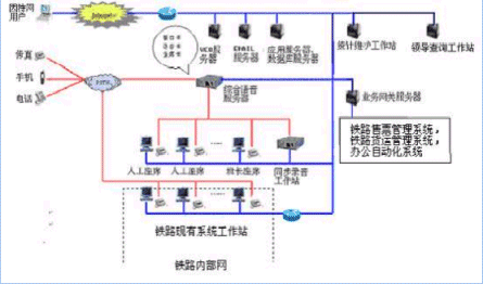 客戶利用電話、傳真、電子郵件、因特網(wǎng)、手機(jī)、網(wǎng)絡(luò)電話等撥打某統(tǒng)一特服號(hào)碼(如100xxxx)進(jìn)入鐵路客戶服務(wù)中心系統(tǒng),本系統(tǒng)依托鐵路各類業(yè)務(wù)技術(shù)支持系統(tǒng)和網(wǎng)絡(luò)系統(tǒng),通過(guò)人工受理或自動(dòng)語(yǔ)音服務(wù)等方式全天24小時(shí)不間斷地為旅客、貨主提供各種鐵路服務(wù);形成了對(duì)外服務(wù)于客戶,對(duì)內(nèi)管理、分析、決策系統(tǒng)相結(jié)合的新型客戶服務(wù)中心。