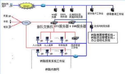 鐵路客戶服務(wù)中心系統(tǒng)主要是由帶語(yǔ)音板卡的計(jì)算機(jī)或排隊(duì)交換機(jī)、CTI服務(wù)器、IVR服務(wù)器、應(yīng)用服務(wù)器/數(shù)據(jù)庫(kù)服務(wù)器、人工座席系統(tǒng)等硬件設(shè)備和應(yīng)用軟件組成。它以電話服務(wù)為主要服務(wù)方式、結(jié)合計(jì)算機(jī)信息系統(tǒng)的資料數(shù)據(jù),為客戶提供全方位的服務(wù),包括業(yè)務(wù)查詢、業(yè)務(wù)咨詢、業(yè)務(wù)受理、投訴和建議、市場(chǎng)調(diào)查等功能。