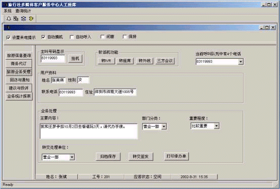 旅行社客戶服務(wù)中心系統(tǒng)將接入功能、導(dǎo)航功能、自動語音查詢功能、人工座席服務(wù)功能、話路轉(zhuǎn)接功能、信息資料處理緊密聯(lián)系起來。用戶撥打特服電話號碼后,可以根據(jù)需要選擇人工服務(wù)、自動語音查詢、自動留言,并能夠在幾種服務(wù)中來回切換或轉(zhuǎn)接其它電話;所記錄的資料可以分門別類的進(jìn)行統(tǒng)計并形成報表,供相關(guān)部門進(jìn)行檢索查閱;意見處理完畢,可由座席主動呼叫用戶,告知處理意見,形成閉環(huán)處理流程;從而打造全新的客戶服務(wù)形象。