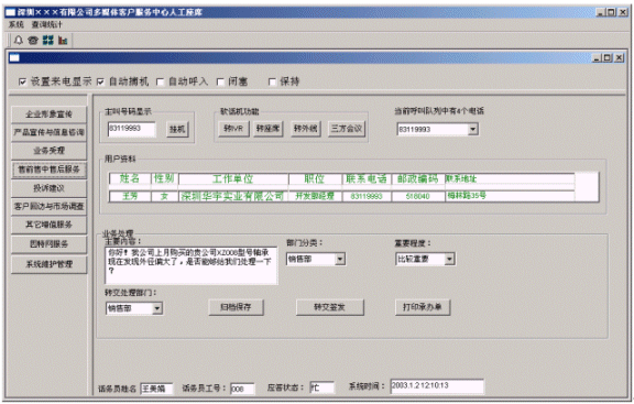 ◇提高企業(yè)親切感:系統在人工服務狀態(tài)下,當業(yè)務代表輸入客戶名稱時,系統即時將客戶與企業(yè)相關的信息顯示在座席終端上,使業(yè)務及時了解客戶,有針對性回答客戶問題,使客戶倍感親切。