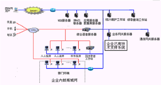 網上服務系統:與INTENET結合,接受來自網上的呼叫請求,提高服務和營銷的質量和效率。