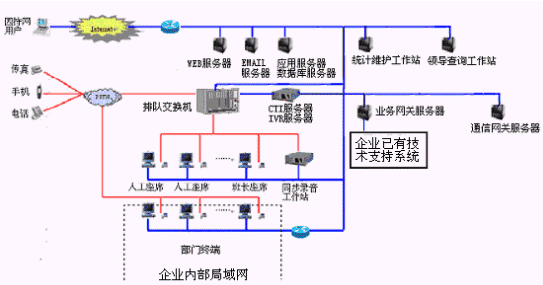 本系統物理結構由帶語音板卡的工控機或排隊交換機、CTI服務器、IVR(交互式語音應答)/IFR(交互式傳真應答)服務器、業(yè)務代表座席(邏輯上分為:普通業(yè)務代表座席、專家座席等)、班長座席、統計維護管理工作站、因特網(WEB)服務器、電子郵件(EMAIL)服務器、數據庫/應用服務器、錄音留言工作站、領導查詢工作站、業(yè)務網關服務器、通信網關、網絡系統等構成。