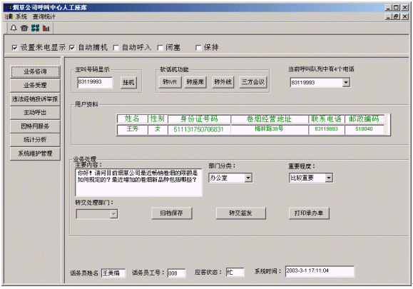 對于每一個座席人員都有一個登錄系統(tǒng)的工號和口令,既保證對其工作量進(jìn)行準(zhǔn)確考核,又保證了對座席工作狀態(tài)的更準(zhǔn)確的監(jiān)控。