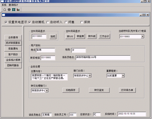 人民群眾打入電話后,當(dāng)系統(tǒng)的自動語音應(yīng)答子系統(tǒng)無法解決客戶問題時(shí),客戶可選擇人工服務(wù),由企業(yè)客戶服務(wù)代表直接接聽客戶電話,處理并解決客戶問題。此時(shí)客戶同座席話務(wù)人員直接溝通,并同時(shí)記錄下該客戶的聯(lián)系方式,將相關(guān)數(shù)據(jù)添加入系統(tǒng)數(shù)據(jù)庫;也可以在數(shù)據(jù)庫的支持下回答質(zhì)量監(jiān)督咨詢、投訴等?蛻粢部梢赃x擇自動語音服務(wù)方式,根據(jù)系統(tǒng)的語音提示輸入按鍵,選擇類別,將自己的投訴和建議以及自己的聯(lián)系方式信息以留言錄音的方式保存在系統(tǒng)中。系統(tǒng)同時(shí)還支持自動傳真方式,客戶可以通過傳真機(jī)進(jìn)入本系統(tǒng),通過按鍵選擇傳真方式,將自己的意見建議等的文本內(nèi)容傳真給系統(tǒng),系統(tǒng)自動接受并存入數(shù)據(jù)庫。