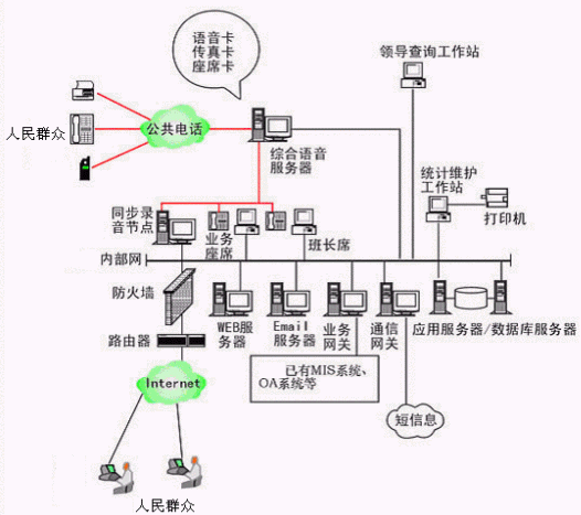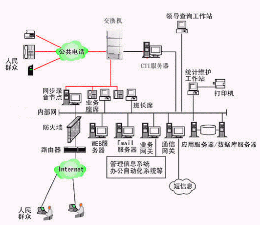 本系統(tǒng)物理結(jié)構(gòu)由排隊(duì)交換機(jī)、CTI服務(wù)器、IVR(交互式語音應(yīng)答)/IFR(交互式傳真應(yīng)答)服務(wù)器、業(yè)務(wù)代表座席(邏輯上分為:普通業(yè)務(wù)代表座席、專家座席、WEB座席等)、班長座席、統(tǒng)計(jì)維護(hù)管理工作站、因特網(wǎng)(WEB)服務(wù)器、電子郵件(EMAIL)服務(wù)器、數(shù)據(jù)庫/應(yīng)用服務(wù)器、錄音留言工作站、領(lǐng)導(dǎo)查詢工作站、業(yè)務(wù)網(wǎng)關(guān)服務(wù)器、通信網(wǎng)關(guān)、網(wǎng)絡(luò)系統(tǒng)等和應(yīng)用軟件構(gòu)成。