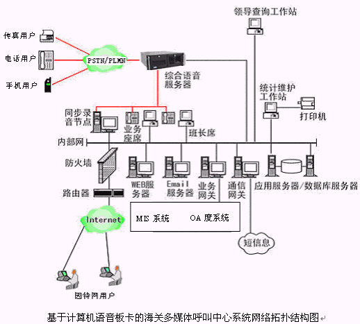 本多媒體呼叫中心的物理結(jié)構(gòu)由帶語音板卡的高工控機(jī)、CTI服務(wù)器、IVR(交互式語音應(yīng)答)/IFR(交互式傳真應(yīng)答)服務(wù)器、業(yè)務(wù)代表座席(邏輯上分為:普通業(yè)務(wù)代表座席、專家座席、WEB座席等)、班長座席/質(zhì)檢座席、統(tǒng)計維護(hù)管理工作站、因特網(wǎng)(WEB)服務(wù)器、電子郵件(EMAIL)服務(wù)器、數(shù)據(jù)庫/應(yīng)用服務(wù)器、錄音留言工作站、領(lǐng)導(dǎo)查詢工作站、業(yè)務(wù)網(wǎng)關(guān)服務(wù)器、通信網(wǎng)關(guān)服務(wù)器、網(wǎng)絡(luò)系統(tǒng)等和應(yīng)用軟件構(gòu)成。