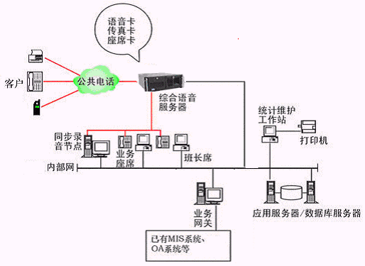 本系統(tǒng)物理結(jié)構(gòu)由帶語音板卡的高性能工控機(jī)(稱為綜合語音服務(wù)器,在功能上可以分為CTI服務(wù)器、IVR(交互式語音應(yīng)答)/IFR服務(wù)器、統(tǒng)計(jì)維護(hù)管理工作站、數(shù)據(jù)庫/應(yīng)用服務(wù)器、錄音留言工作站、業(yè)務(wù)網(wǎng)關(guān)服務(wù)器、業(yè)務(wù)代表座席、網(wǎng)絡(luò)系統(tǒng)等和應(yīng)用軟件構(gòu)成。