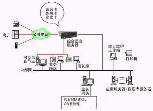 本系統(tǒng)物理結構由帶語音板卡的高性能工控機(稱為綜合語音服務器,在功能上可以分為CTI服務器、IVR(交互式語音應答)/IFR服務器、統(tǒng)計維護管理工作站、數(shù)據庫/應用服務器、錄音留言工作站、業(yè)務網關服務器、業(yè)務代表座席、網絡系統(tǒng)等和應用軟件構成。