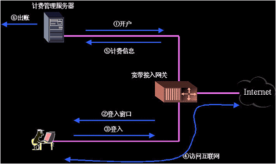 當(dāng)用戶選擇上網(wǎng)后。管理人員首先通過(guò)計(jì)費(fèi)管理服務(wù)器為用戶開(kāi)戶。出用戶在打開(kāi)瀏覽器試圖訪問(wèn)Internet時(shí)會(huì)彈來(lái)自接入網(wǎng)關(guān)要求登入的窗口。用戶輸入用戶名、密碼并可以選擇適合自己的資費(fèi)方式。輸入信息后接入網(wǎng)關(guān)將信息交由計(jì)費(fèi)管理服務(wù)器處理。計(jì)費(fèi)管理服務(wù)器驗(yàn)證通過(guò)后,向該用戶開(kāi)放互聯(lián)網(wǎng)出口。在用戶訪問(wèn)互聯(lián)網(wǎng)的同時(shí),接入網(wǎng)關(guān)計(jì)錄下該用戶訪問(wèn)互聯(lián)網(wǎng)的相關(guān)信息,其中包括訪問(wèn)的時(shí)長(zhǎng)和數(shù)據(jù)流量。接入網(wǎng)關(guān)實(shí)時(shí)地向計(jì)費(fèi)管理服務(wù)器更新用戶的計(jì)費(fèi)信息,用戶斷網(wǎng)后計(jì)費(fèi)管理服務(wù)器計(jì)算用戶上網(wǎng)費(fèi)用。