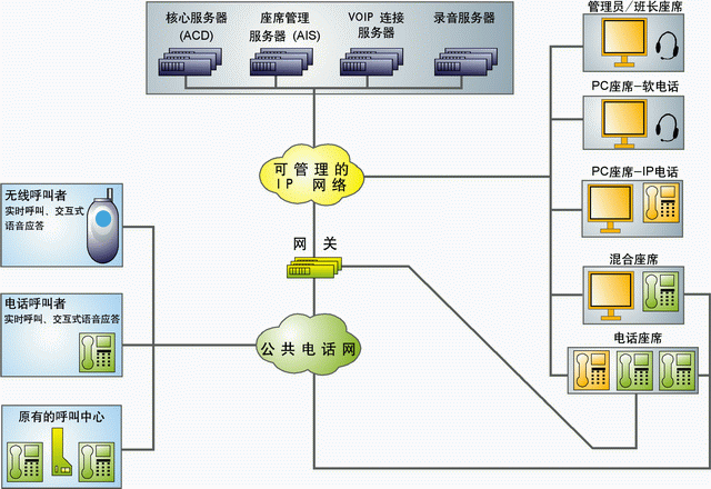 | 支持多種呼入方式 | 普通電話呼入、消息(e-mail、語音留言、傳真)呼入、Internet呼入。 | ![]() |