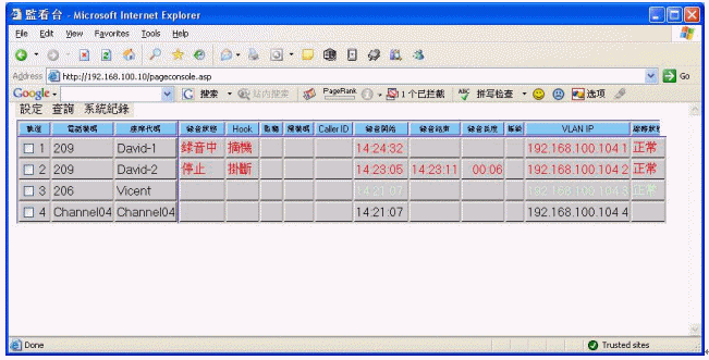 監(jiān)看臺:系統(tǒng)登入后的主畫面,可以監(jiān)控各路電話的當前使用情況(包括來電號碼、去電號碼、振鈐次數(shù)、錄音開始時間、錄音結(jié)束時間、線路狀況等信息)。并可以實現(xiàn)對任意通話的網(wǎng)絡(luò)實時監(jiān)聽。