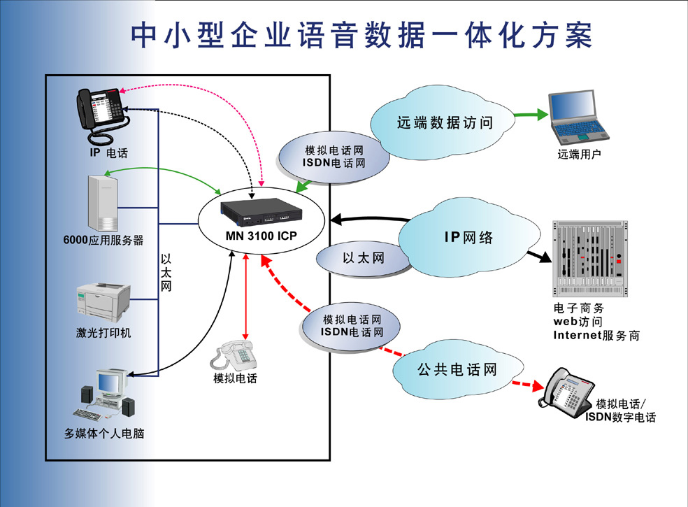 商務(wù)電話系統(tǒng)、本地網(wǎng)和網(wǎng)關(guān)集成在統(tǒng)一的平臺(tái)上?敏迪網(wǎng)絡(luò)推出的MN3100綜合通信平臺(tái)就是這樣簡(jiǎn)單快捷的滿足您的需要,它是專(zhuān)為小型企業(yè)或大型企業(yè)的分支機(jī)構(gòu)而設(shè)計(jì)的語(yǔ)音數(shù)據(jù)集成的解決方案。