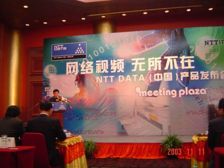 2003年11月11日,NTT DATA(中國)有限公司,在長城飯店舉行了名為“網(wǎng)絡(luò)視頻——無所不在”的產(chǎn)品發(fā)布會。會上,NTT DATA(中國)有限公司正式推出了一款網(wǎng)絡(luò)視頻軟件產(chǎn)品——“MeetingPlaza”。此產(chǎn)品開拓了視頻系統(tǒng)在圖像效果、控制靈活度以及性價比上的全新應(yīng)用模式。該產(chǎn)品的開發(fā)商NTT-IT,自2001年6月起在日本開始系統(tǒng)的銷售及提供ASP服務(wù)。到現(xiàn)在已經(jīng)向500家以上的日本企業(yè)及地方政府提供了服務(wù),在日本深受好評。在中國,雖然軟件視頻會議系統(tǒng)還處在起步階段,但依據(jù)未來視頻通訊的廣大需求,以及“MeetingPlaza”具有的投入成本低、限制少和適用性強的特點,都將使該產(chǎn)品更加具有市場潛力。