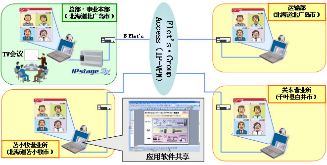 此次開始投入運(yùn)行的IP電話系統(tǒng),在其總部導(dǎo)入了“IPstage SX”,通過沖電氣的“Com@WILL軟電話”具有的TV會(huì)議功能,能將包括總部在內(nèi)的北海道3個(gè)事業(yè)所與關(guān)東營業(yè)所進(jìn)行電話聯(lián)網(wǎng)。各個(gè)事業(yè)所之間通過NTT東日本的IP-VPN服務(wù)“Flet's・Group”實(shí)現(xiàn)相互連接。