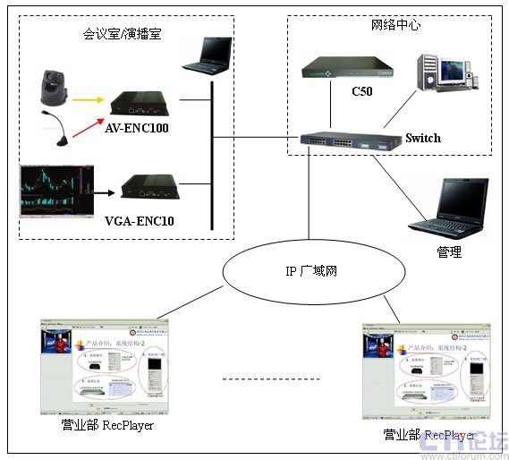 在分析了海通證券的實際需求和網(wǎng)絡(luò)環(huán)境以后,決定采用一套DSS-R-C50+來組建整個媒體廣播系統(tǒng)。系統(tǒng)由媒體采集系統(tǒng)AV-ENC100/VGA-ENC100,流媒體處理和錄制系統(tǒng)C50和媒體接收系統(tǒng)RecPlayer組成。通過此系統(tǒng)可以實現(xiàn)語音、視頻和計算機桌面的同步實時直播、錄制和點播。系統(tǒng)的結(jié)構(gòu)圖如下: