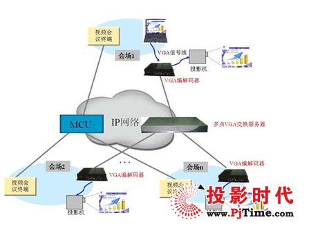 視頻會議系統(tǒng)帶外硬雙流解決方案的核心是基于IP網絡實現(xiàn)VGA信號的采集編碼、多點交換、解碼顯示。在本方案中,通過VGA編解碼器實現(xiàn)VGA信號的采集編碼及解碼顯示,VGA信號的多點交換則通過多點VGA交換服務器實現(xiàn),因采用硬件方式實現(xiàn)VGA信號的編解碼,且VGA信號流在視頻會議視音頻信號流之外傳送,故稱“帶外硬雙流”。采用帶外硬雙流解決方案,組網靈活,管理方便,可以配合任何制式及品牌的視頻會議實現(xiàn)雙流功能。