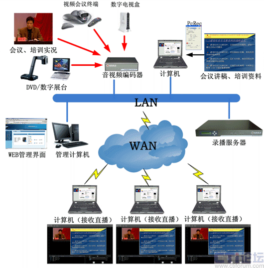 如上圖所示,會易錄采用前后臺分離模式,前臺設(shè)備(視音頻編碼器、數(shù)據(jù)編碼器)負(fù)責(zé)信號采集;后臺設(shè)備(多媒體錄播服務(wù)器)負(fù)責(zé)信號處理。前后臺設(shè)備之間通過IP網(wǎng)絡(luò)進(jìn)行通訊。上述編碼器可將采集到的視音頻信號和計(jì)算機(jī)屏幕信號編碼后通過網(wǎng)絡(luò)發(fā)送到后臺的多媒體錄播服務(wù)器,多媒體錄播服務(wù)器可將收到的視音頻信號和計(jì)算機(jī)屏幕信號進(jìn)行同步一體化的錄制、直播、點(diǎn)播。