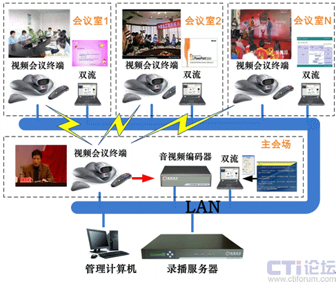 當(dāng)需要錄制沒有錄播的其他會議室實(shí)況時,通過主會場視頻會議終端呼叫任意會場的終端,即可錄制任意會場的會議實(shí)況,如下圖: