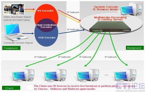 Encoder可用于采集高清視頻的信號或者VGA的信號。前臺的編碼器編碼好通過IP網絡傳送到服務器Multimedia