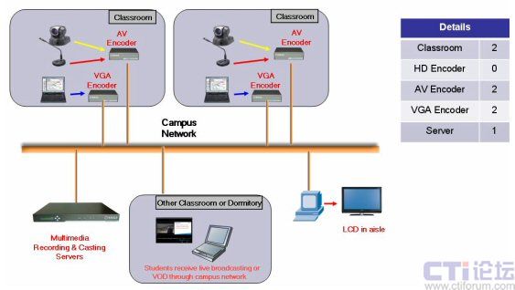 如上圖所示,服務器型號為DSS-R-T2,T系列的產品是銳取公司專門應用于教育行業(yè)的產品。T2可支持兩個教室的同時錄制與直播,放置在學校數據中心的機房中。兩個AV Encoder和兩個VGA Encoder分別放置在需要做錄制直播的教室中。學生通過校園網或者Internet連接到服務器即可收看多媒體教學的直播,包括老師的圖像聲音以及講解的課件內容。在教學樓中,每一層的走廊里都安裝了大的LCD顯示屏,服務器上的多媒體內容也將同時傳到這些顯示屏上。