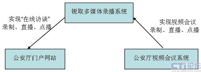 銳取多媒體錄播系統(tǒng)采用了分布式的架構(gòu),前端的視音頻編碼器負(fù)責(zé)視音頻信號(hào)的采集,后臺(tái)的多媒體錄播服務(wù)器負(fù)責(zé)信號(hào)的錄制、直播和點(diǎn)播。前端的視音頻編碼器可從視頻會(huì)議系統(tǒng)中獲取信號(hào),這樣“在線訪談”的公安機(jī)關(guān)領(lǐng)導(dǎo)或?qū)<铱梢栽谝曨l會(huì)議中的任何一個(gè)會(huì)場(chǎng)與廣大網(wǎng)民在線交流。